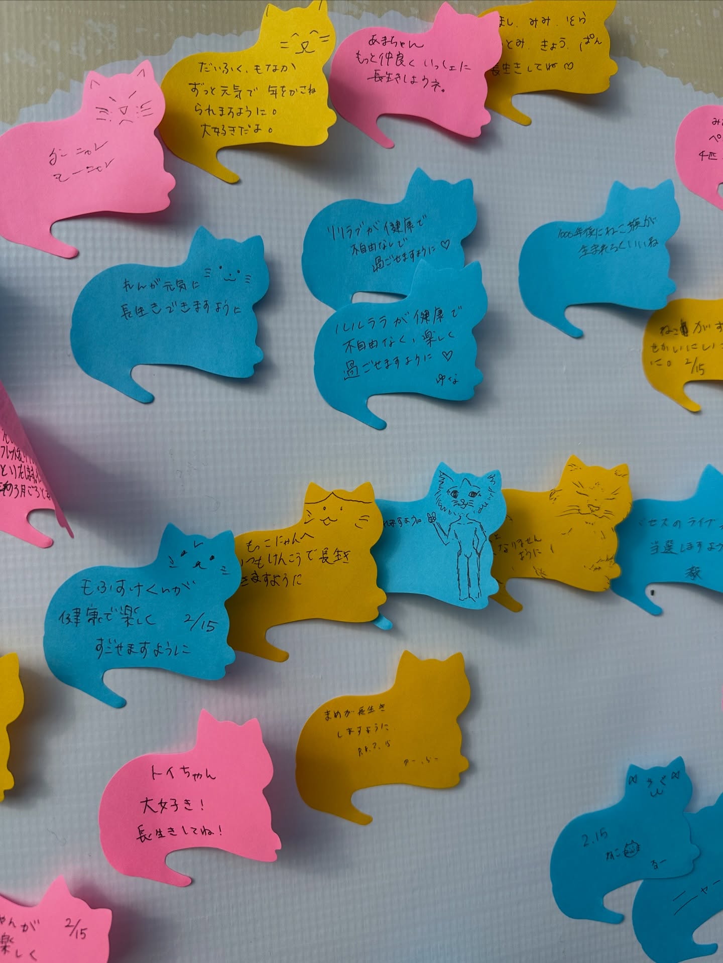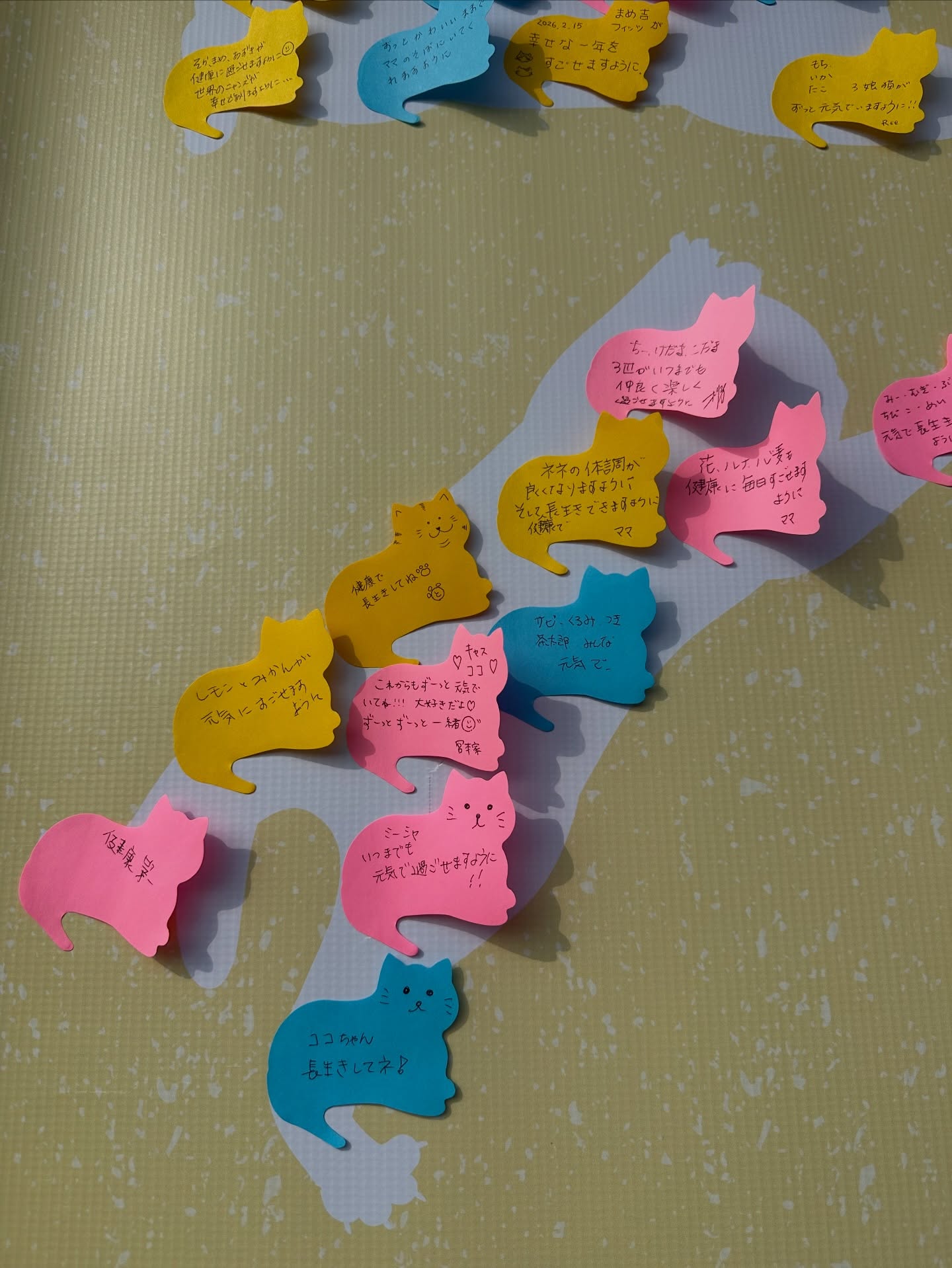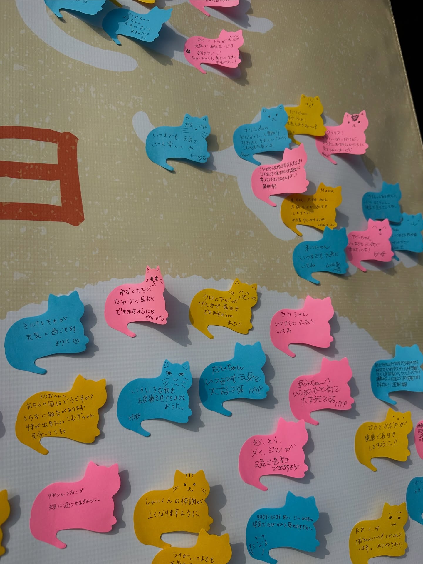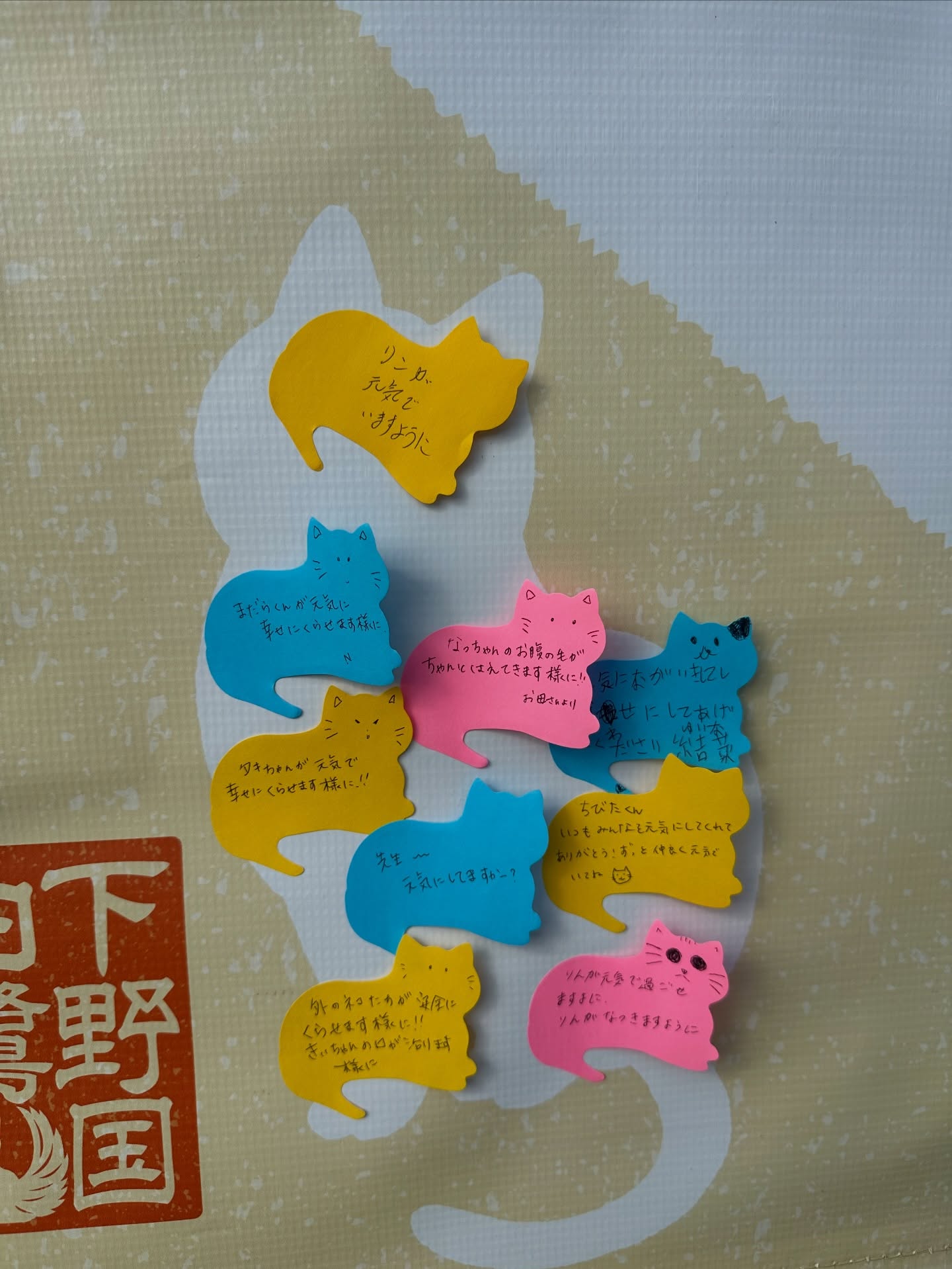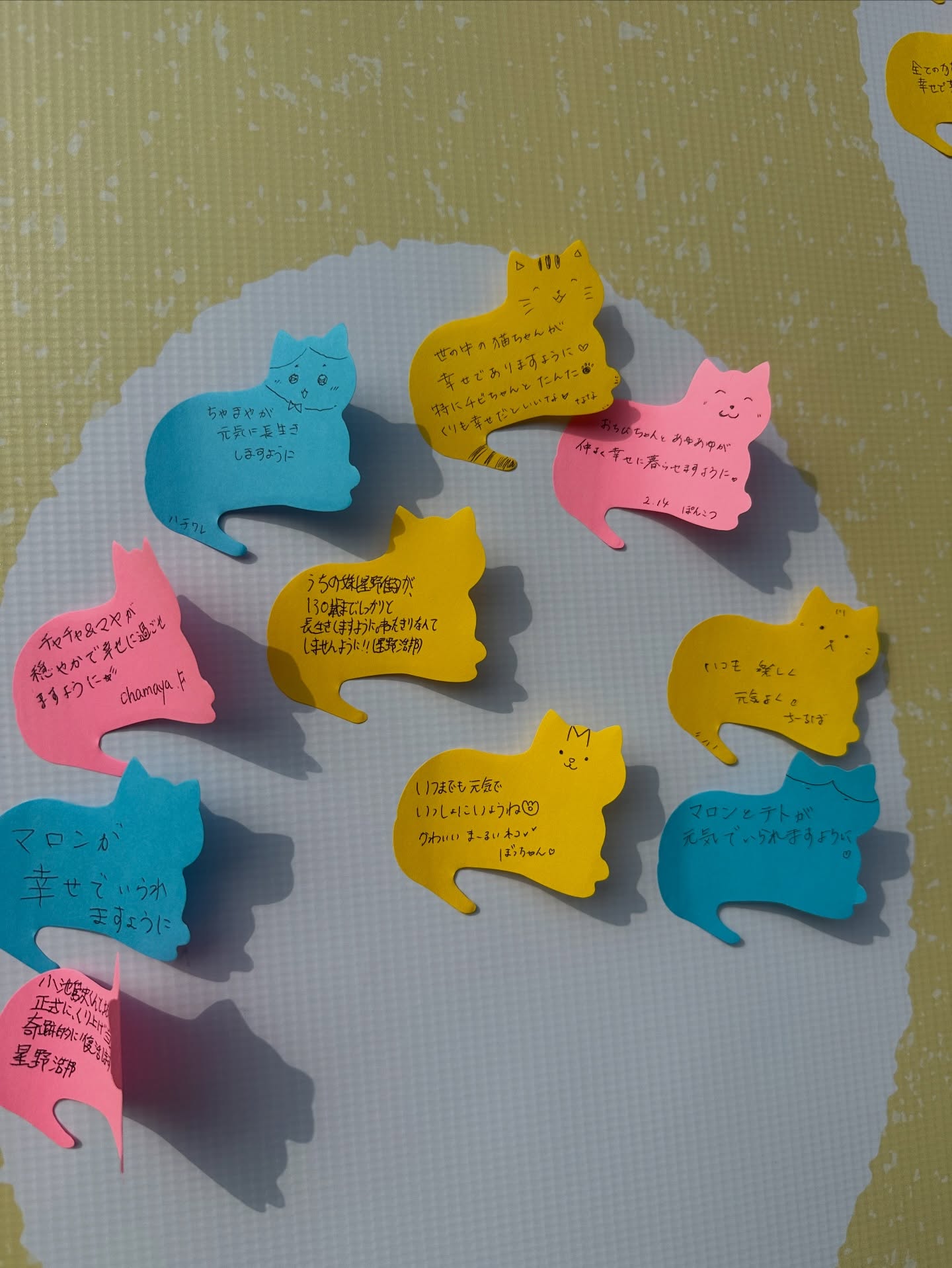 また、期間中は猫ちゃんへのメッセージや猫ちゃんへの願い事を書き込める、猫ちゃん型のふせんを用意しておりますので、専用の幕に貼り付けてください
